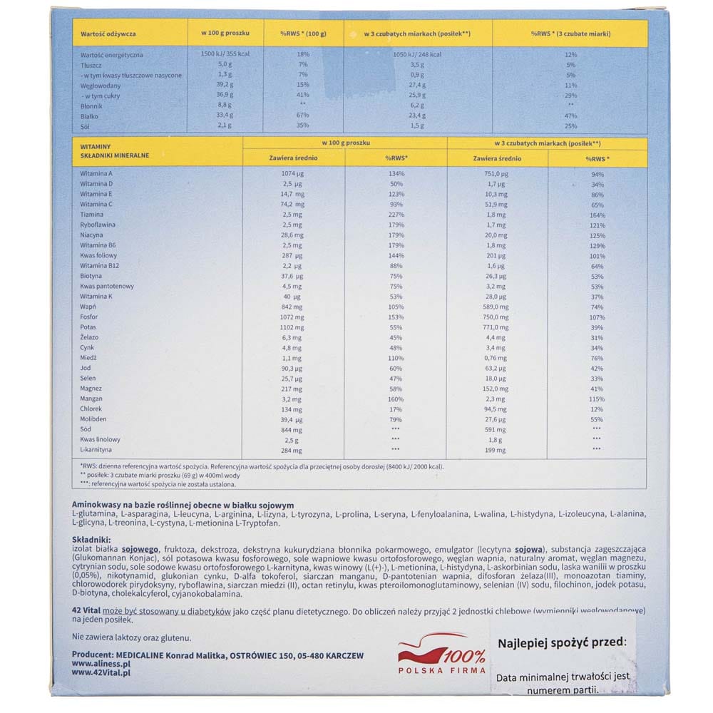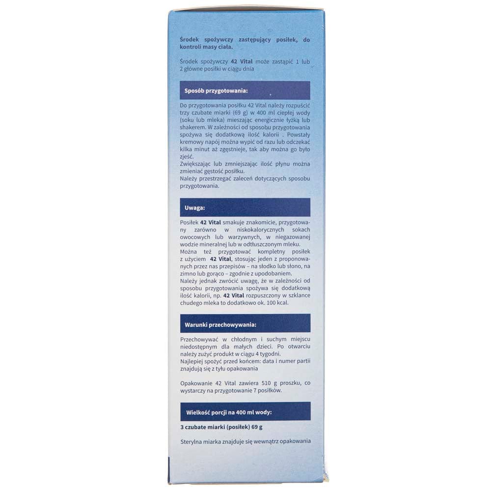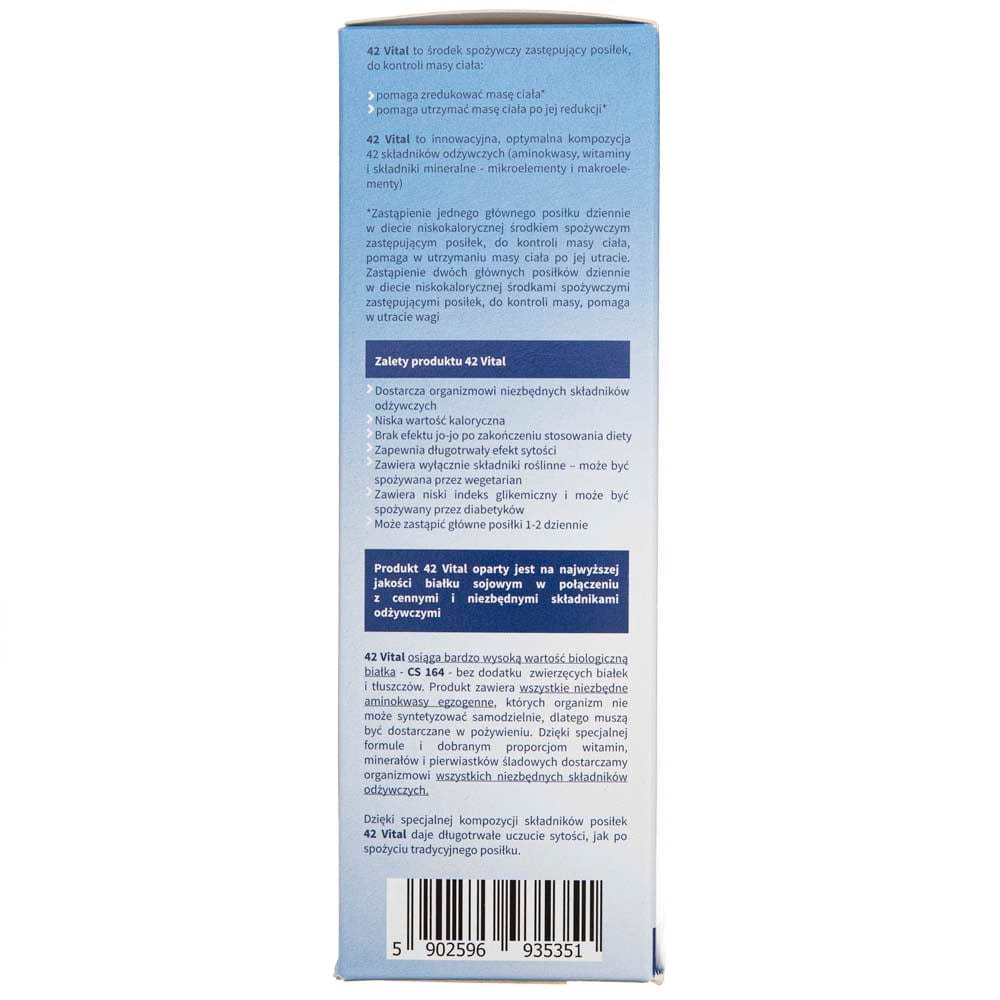 Foodstuff replacing a whole day diet, for weight control. 42 Vital contains an optimal composition of 42 active ingredients (vitamins, amino acids, minerals, micronutrients). The product also provides a large amount of valuable fiber, whose fibers last longer in the stomach providing a feeling of satiety, as after eating a hearty meal.
