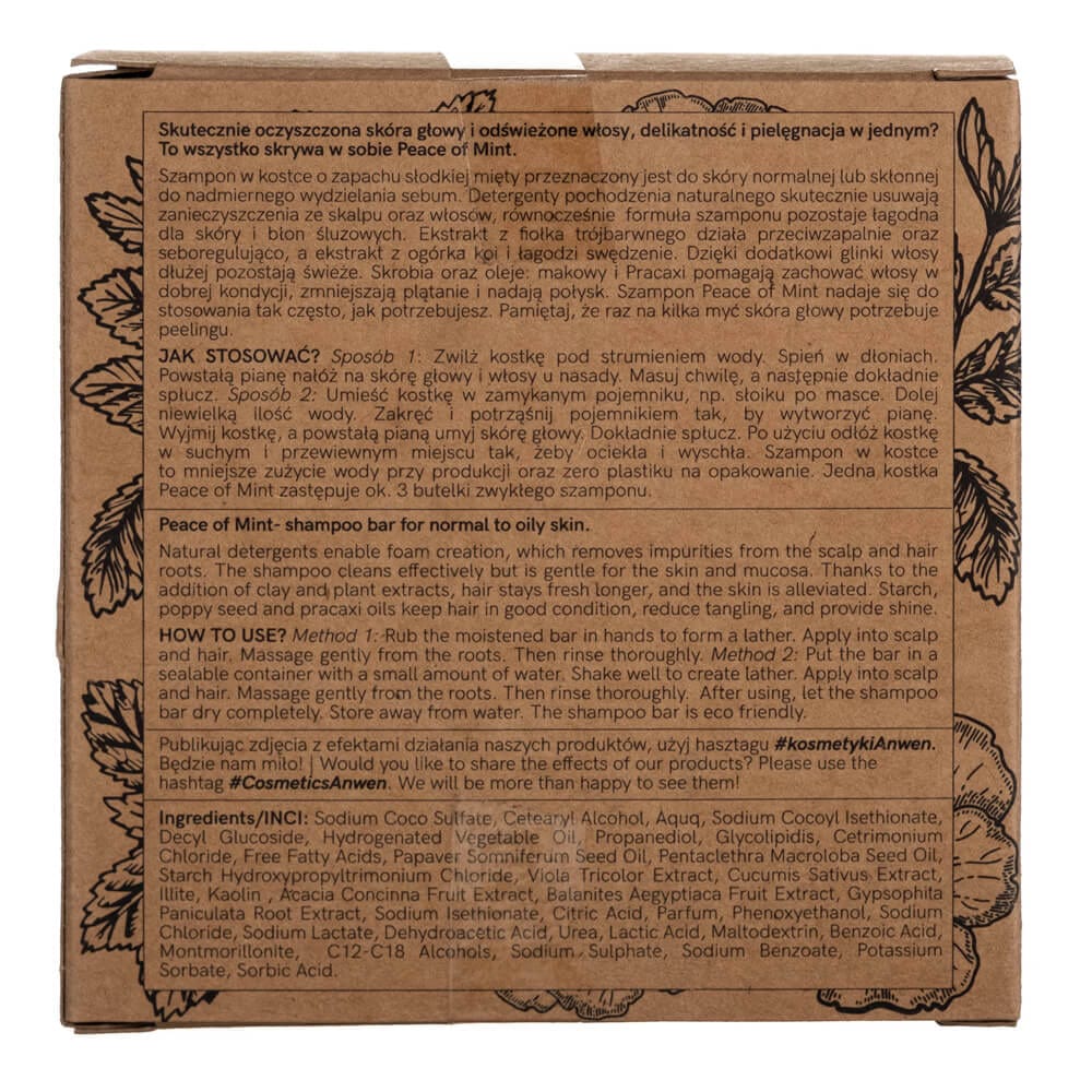Sweet mint-scented bar shampoo is designed for normal skin or skin prone to excessive sebum secretion. Detergents of natural origin effectively remove impurities from the scalp and hair, while the shampoo formula remains gentle on the skin and mucous membranes. Violet extract has an anti-inflammatory and seboregulatory effect, while cucumber extract soothes and alleviates itching. Thanks to the addition of clay, hair stays fresh for longer. Starch and poppy seed and pracaxi oils help keep hair in good condition, reduce tangling and provide shine.