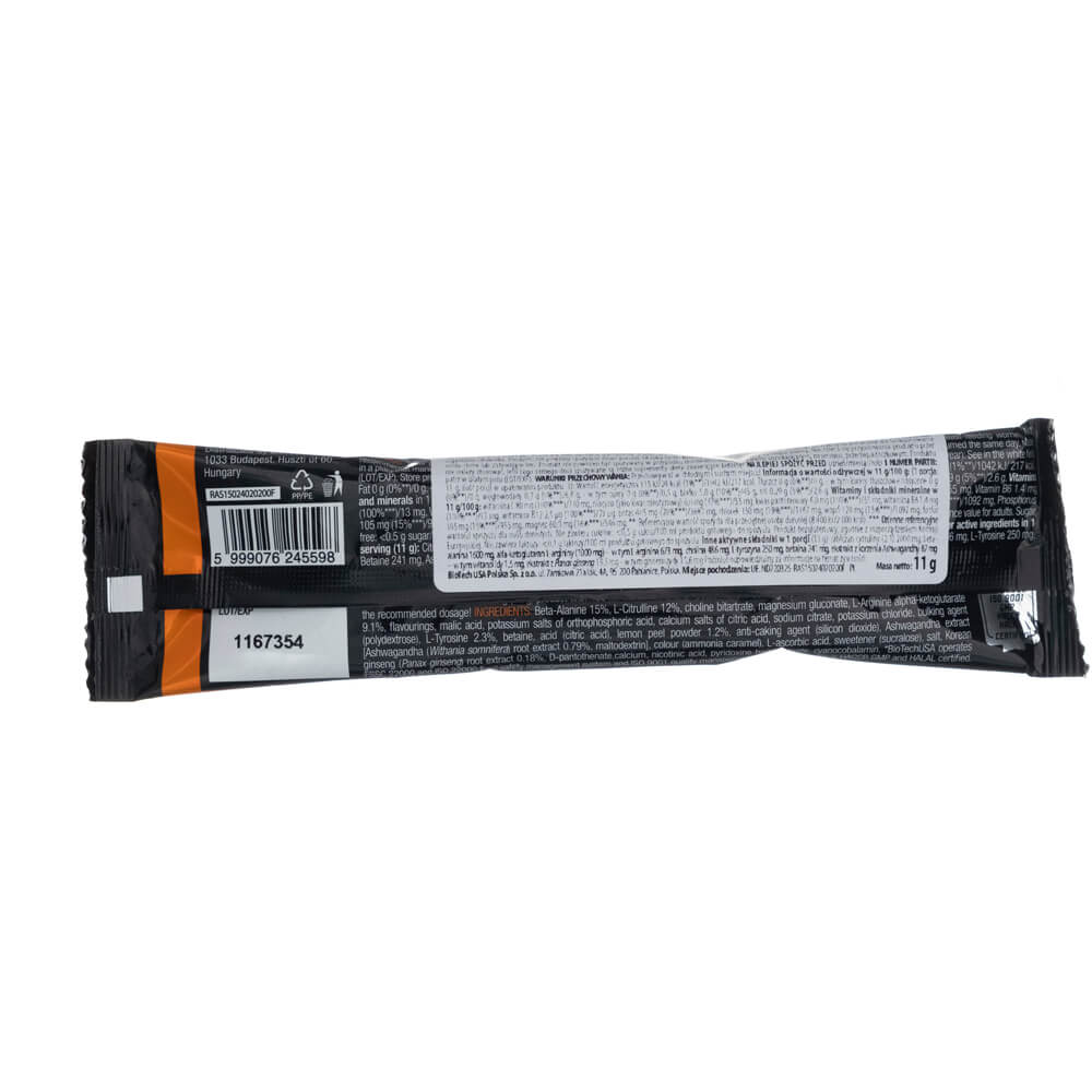 Beta-alanine 15%, L-citrulline 12%, choline tartrate, magnesium gluconate, L-arginine alpha-ketoglutarate 9.1%, flavours, malic acid, orthophosphoric acid potassium salts, calcium salts of citric acid, sodium citrate, potassium chloride, bulking agent (polydextrose), L-tyrosine 2.3%, betaine, acid (citric acid), lemon peel powder 1.2%, anti-caking agent (silicon dioxide), Ashwagandha extract [Ashwagandha root extract (Withania somnifera) 0.79%, maltodextrin], dye (ammoniacal caramel), L-ascorbic acid, sweetener (sucralose), salt, Korean ginseng root extract (Panax ginseng) 0.18%, calcium D-pantothenate, nicotinic acid, pyridoxine hydrochloride, cyanocobalamin. Manufactured in a facility that processes milk, eggs, soya, peanuts, nuts, celery, fish, crustaceans, molluscs and food ingredients containing sulphur dioxide.