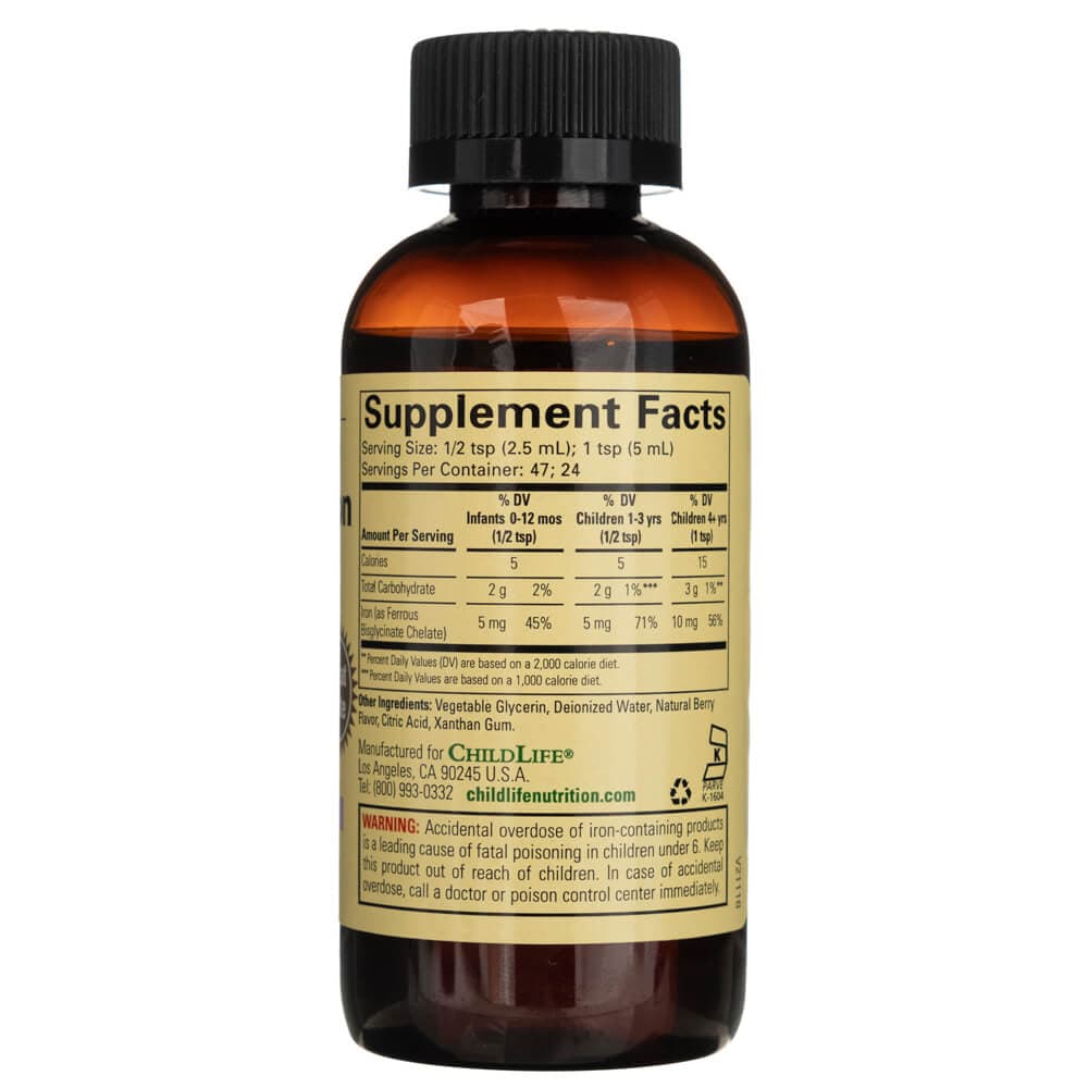 Liquid Iron by ChildLife, is a berry-flavored liquid dietary supplement containing iron - essential for the healthy growth and development of children.