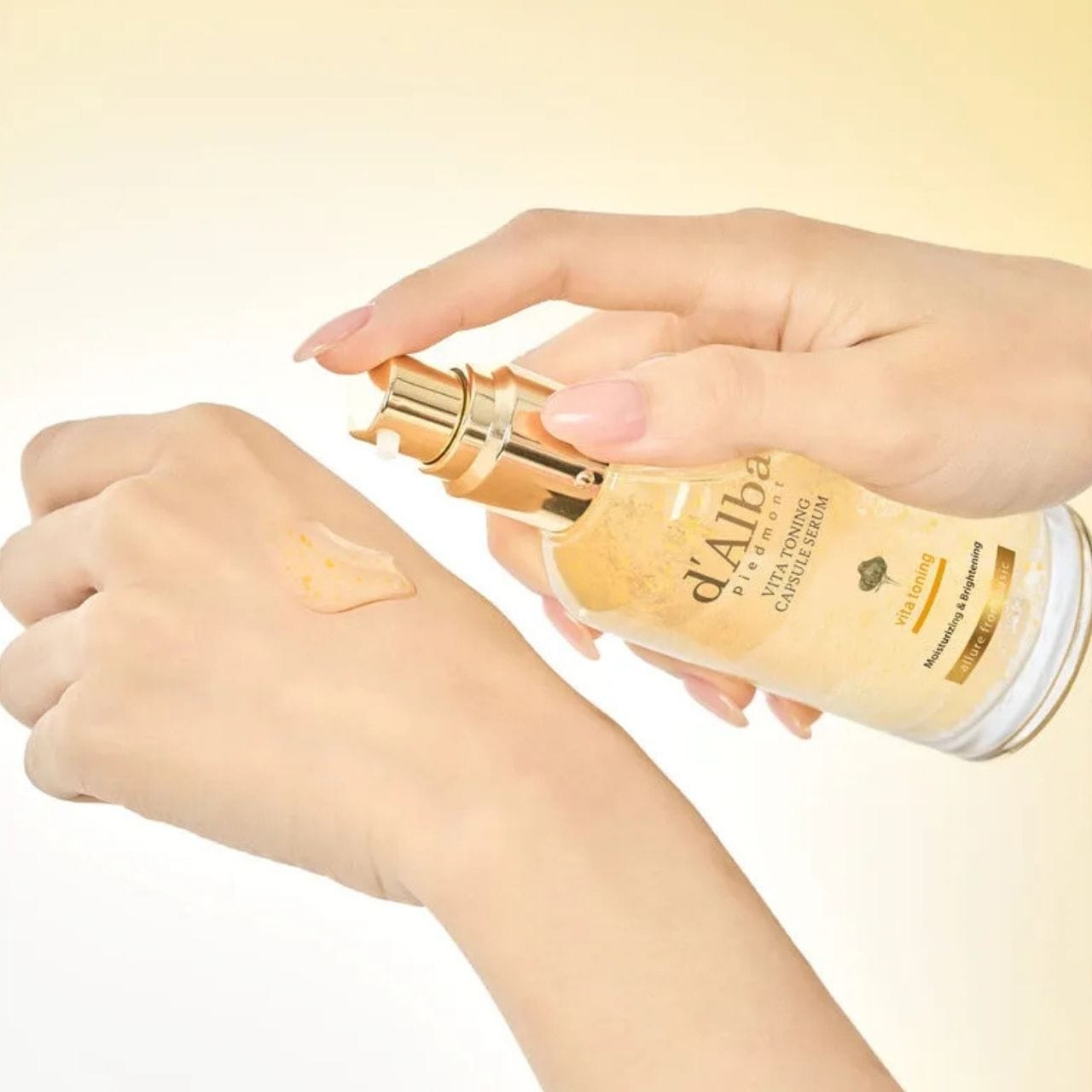 Serum D'Alba Vita Toning to breakthrough formula based on pure sea buckthorn water which provides the skin with natural vitamin energy. The unique 40,000 vitamin capsules released during application provide intensive nourishment and an immediate brightening effect. The advanced Vitality Complex combines moisturising, regenerating and anti-ageing active ingredients that work synergistically from the inside out.