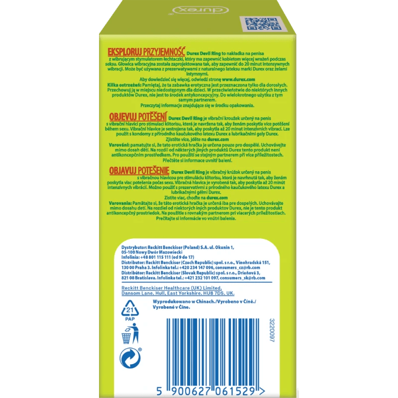Durex Devil Ring is a penis pad with vibrating clitoral stimulator designed to give women more sensation during sex. The vibrating head is designed to provide up to 20 minutes of intense vibration. It can be used with Durex brand natural latex condoms and intimate gels.