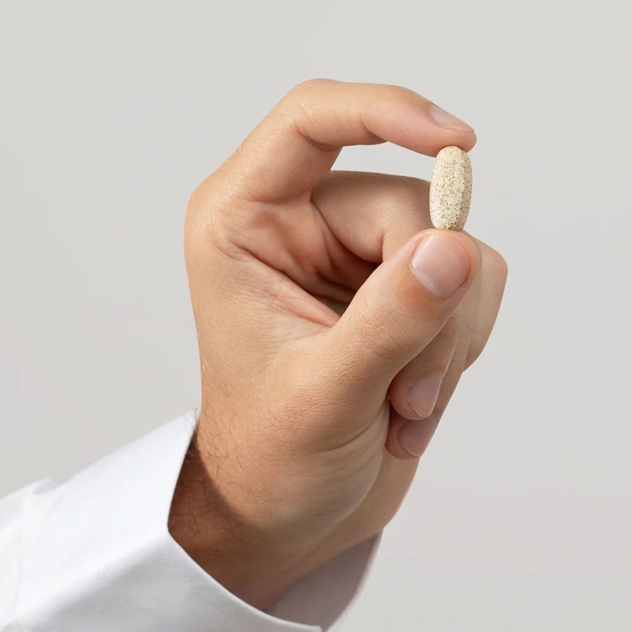 Niacin (as niacinamide), Vitamin B6 (pyridoxine HCl), Folic acid, Biotin, Pantothenic acid (d-calcium pantothenate), Iodine (from seaweed thallus extract (standardised to 1%)), Zinc (from zinc gluconate), Copper (from copper gluconate), Saw palmetto extract (fruit), Nettle extract (root), Ginkgo extract (leaf) (standardised to 24% glycosides, 6% terpenes), Plant sterols, Ginger extract (root and rhizome), Taurine, American ginseng extract (root) (standardised to 5% ginsenosides), dicalcium phosphate dihydrate, Microcrystalline cellulose, Vegetable stearic acid, Croscarmellose sodium, Hypromellose, Vegetable magnesium stearate, Silicon dioxide, Acacia gum, Vanilla coating in water (Hydroxypropyl methylcellulose, Acacia gum, Glycerin, Sunflower oil, Natural flavouring, Maltodextrin, Triacetin).