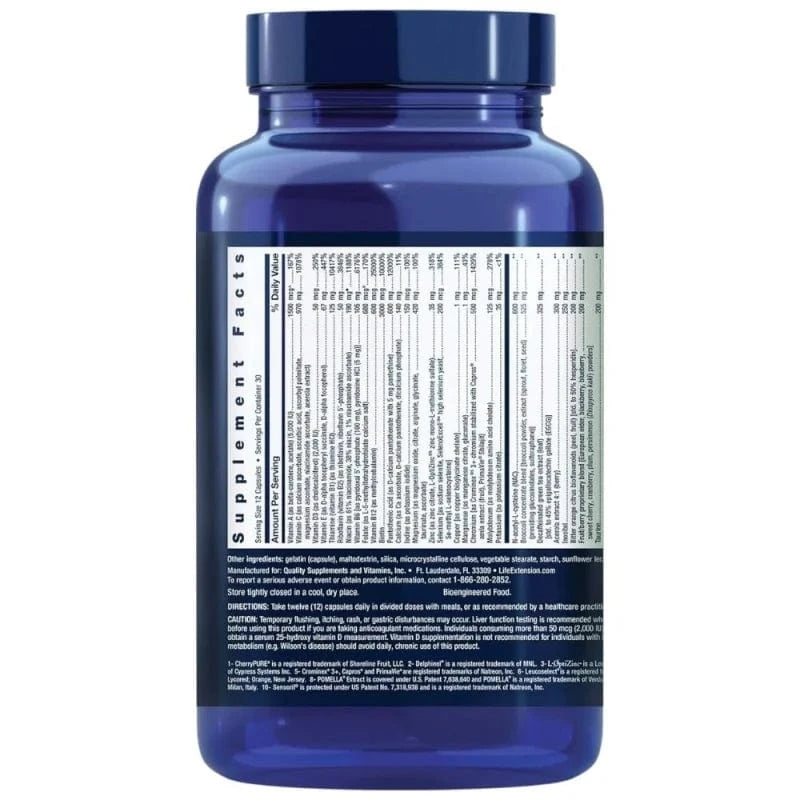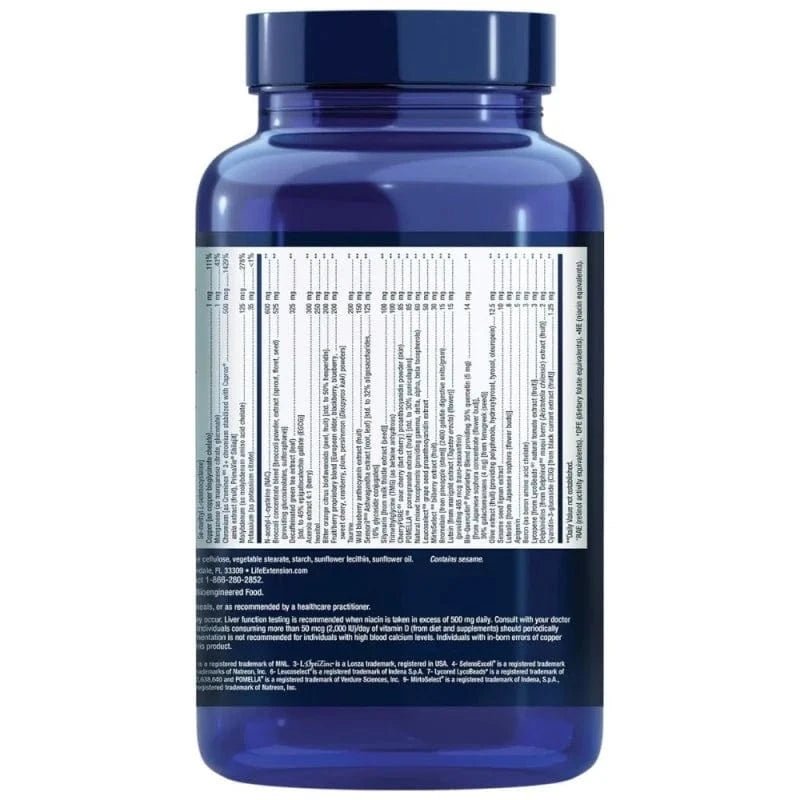 Vitamin A (as beta-carotene, acetate) (5000 IU), Vitamin C (as calcium ascorbate, ascorbic acid, ascorbyl palmitate, magnesium ascorbate, niacinamide ascorbate, acerola extract), Vitamin D3 (as cholecalciferol) (2000 IU.), Vitamin E (as D-alpha tocopheryl succinate, D-alpha tocopherol), Thiamine (vitamin B1) (as thiamine hydrochloride), Riboflavin (vitamin B2) (as riboflavin, Riboflavin 5'-phosphate), Vitamin B6 [as pyridoxal 5'-phosphate (100 mg), pyridoxine HCI (5 mg)], Folate (as calcium salt of L-5-methyltetrahydrofolate), Vitamin B12 (as methylcobalamin), Biotin, Pantothenic acid (as calcium D-pantothenate with 5 mg pantethine), Calcium (as calcium ascorbate, calcium D-pantothenate, dicalcium phosphate), Iodine (as potassium iodide), Magnesium (as magnesium oxide, citrate, arginate, glycinate, taurate, ascorbate), Zinc (as zinc citrate, L-OptiZinc®3 zinc mono-L-methionine sulphate), Selenium [as sodium selenite, SelenoExcell®4 high selenium yeast, Se-methyl-L-selenocysteine], Copper [as copper bisglycinate chelate], Manganese (as manganese citrate, manganese gluconate), Chromium [as Crominex®5 3+ chromium stabilised with Capros® amla extract (fruit), PrimaVie® Shilajit], Molybdenum (as molybdenum amino acid chelate), Potassium (as potassium citrate), Broccoli concentrate blend [broccoli powder, extract (sprouts, inflorescences, seeds) (providing glucosinolates, sulforaphane)], N-acetyl-L-cysteine (NAC), Decaffeinated green tea extract (leaf) [std. up to 45% epigallocatechin gallate (EGCG)], Acerola extract 4:1 (berries), Inositol, Citrus bioflavonoids from bitter orange (peel, fruit) [std. up to 50% hesperidin], Proprietary fruit and berry blend [elderberry, blackberry, blueberry, cherry, cranberry, plum, persimmon (Diospyros kaki) powder], Taurine, Wild blueberry anthocyanin extract (fruit), Sensoril®10 Ashwagandha extract (root, leaf) [std. up to 32% oligosaccharides, 10% glycosidic conjugates], Silymarin [from Milk Thistle extract (seed)], Trimethylglycine (TMG) (as anhydrous betaine), CherryPure®1 proanthocyanidin extract (peel), POMELLA®8 Pomegranate extract (fruit) [std. up to 30% punicalagins], Natural mixed tocopherols (providing gamma, delta, alpha, beta tocopherols), MirtoSelect®9 blueberry extract (fruit), Leucoselect®6 grape seed proanthocyanidin extract, Bio-Quercetin® Proprietary Blend providing 35% quercetin (5 mg) [from Japanese sophora concentrate (flower bud)], 30% galactomannans (4 mg) [from fenugreek (seed)] 15 mg, Bromelain [from pineapple (stem)] (2400 gelatin digestive units/gram), Lutein [from marigold extract (flower)] (providing 465 mcg trans-zeaxanthin), Olive extract (fruit) (providing polyphenols, hydroxytyrosol, tyrosol, oleuropein), Sesame seed lignan extract, Luteolin [from Japanese sofora (flower buds)], Apigenin, Boron (as amino acid chelate of boron), Lycopene [from LycoBeads®7 natural tomato extract (fruit)], Delphinidin [from Delphinol®2 extract from maqui berries (Aristotelia chilensis) (fruit)], Cyanidin 3-glucoside (C3G) [from blackcurrant extract (fruit)], Gelatin (capsule), Filling agents: maltodextrin, silica, microcrystalline cellulose, vegetable stearate, starch, sunflower lecithin, sunflower oil.