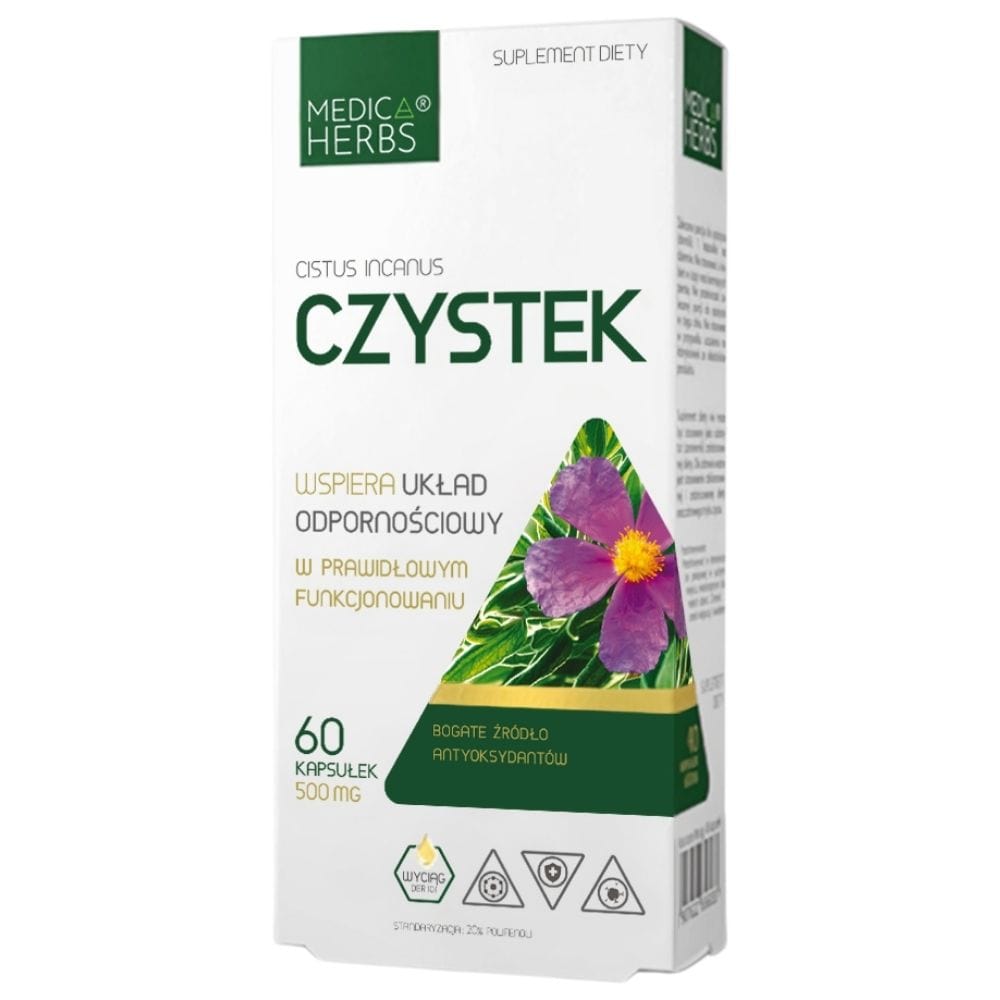 A dietary supplement in capsules from Medica Herbs. The product contains 500 mg of Rockrose extract (Cistus incanus) standardised to contain 20% polyphenols. The product does not contain any artificial additives such as preservatives, colours, flavours, fillers.