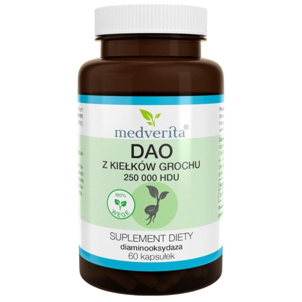 Medverita DAO from pea sprouts is a highly concentrated dietary supplement in capsules, containing as much as 250,000 HDU of diaminase (DAO) in one capsule. This enzyme plays a key role in the breakdown of histamine, protecting the body from its excess and accompanying symptoms, such as headaches, hives, and digestive problems.