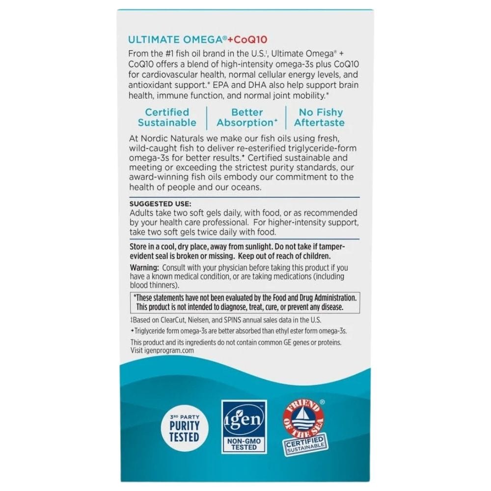 Nordic Naturals Ultimate Omega + CoQ10 is a dietary supplement in gel capsules. A source of Omega-3 fatty acids with the addition of coenzyme Q10.
