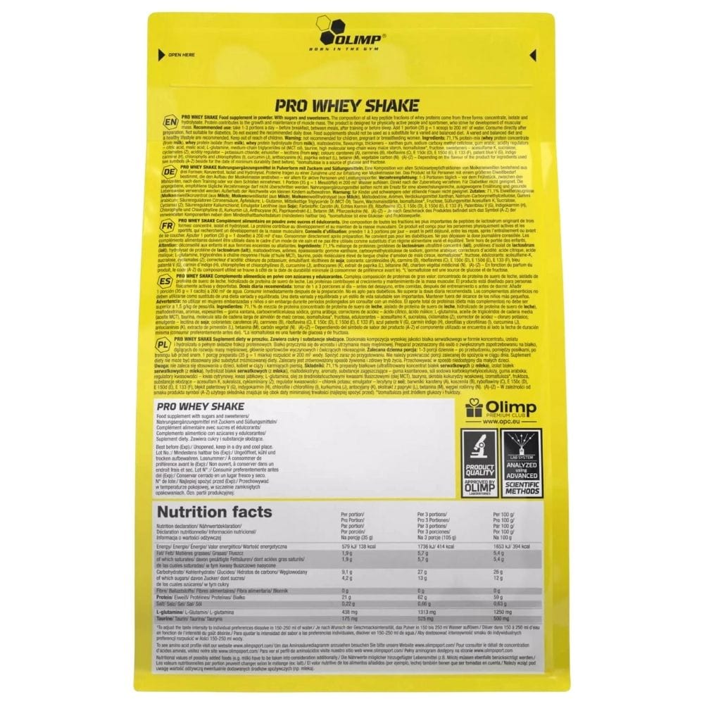 Olimp Pro Whey Shake is a powdered dietary supplement. A protein supplement created for people with increased protein requirements aiming to develop muscle mass, mainly professional athletes and recreational exercisers. It combines three sources of protein: hydrolysate, isolate and whey concentrate.