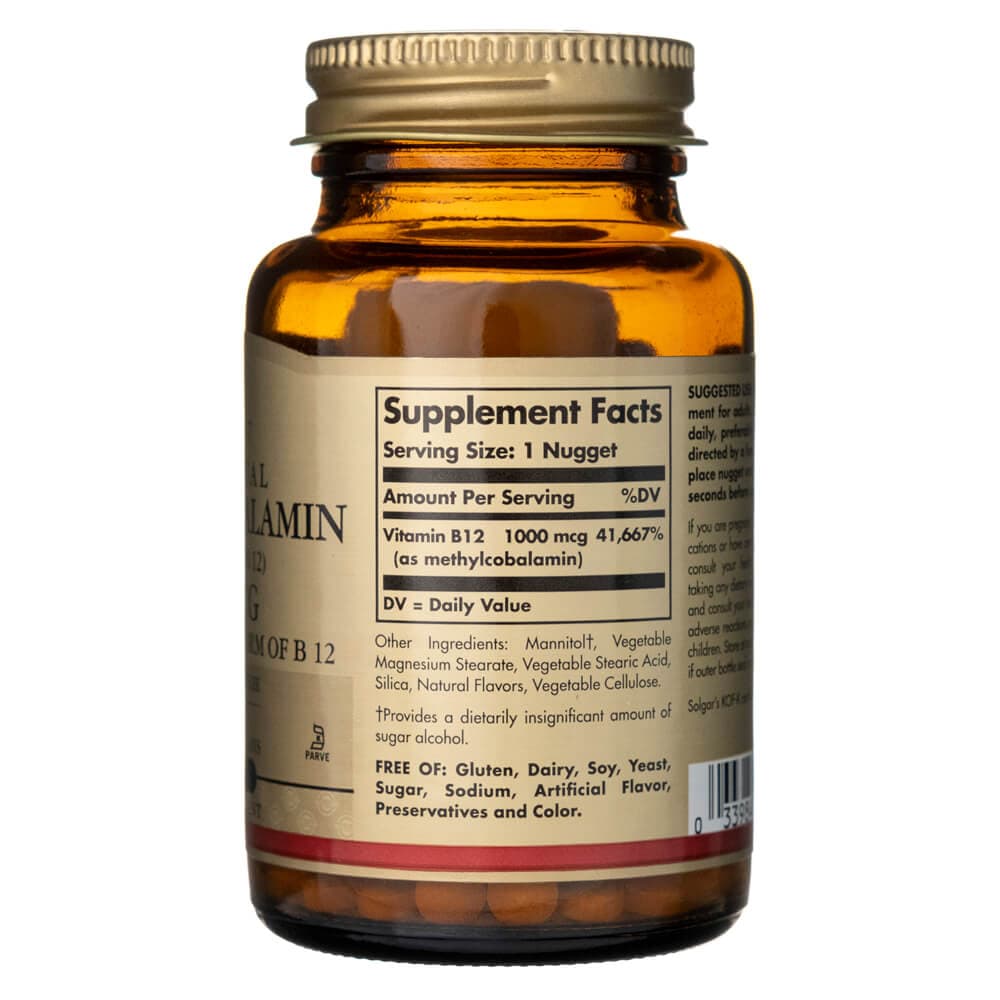 Solgar® Methylcobalamin nuggets contain a body-ready, active form of Vitamin B12. Shift workers, college students, mothers and the elderly may use this supplement to support energy metabolism.