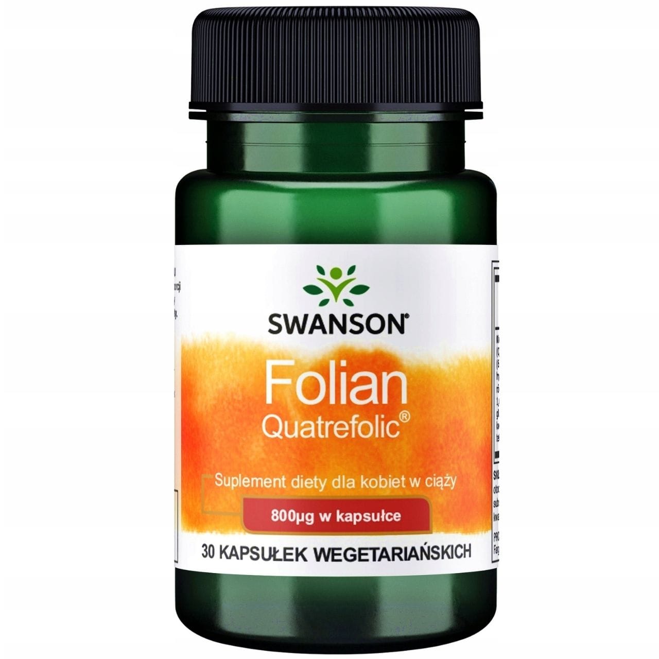 Swanson Folic Acid (Quatrefolic®) is a dietary supplement containing folic acid in the innovative Quatrefolic® form, which is characterised by high bioavailability. Each capsule provides 800 µg of folic acid.